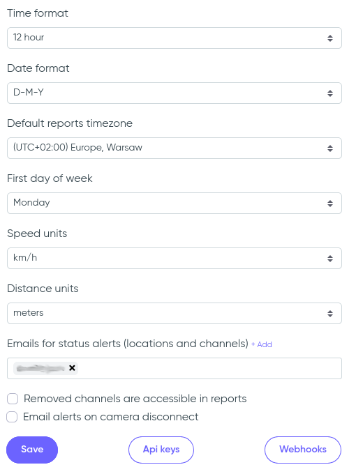 - Default reports timezone – select the default timezone used in reports (can be overridden per report);
